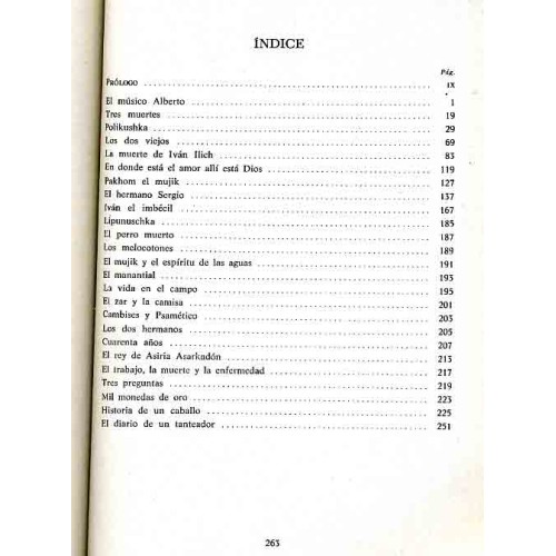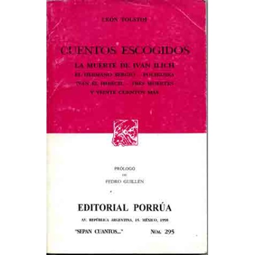Décima edición. 263 páginas, tapa blanda. Estado regular (en una página del prólogo hay un pequeño fallo tipográfico). Texto en dos columnas. Cuentos: La muerte de Iván Ilich. El hermano Sergio. Polikuska. Iván el Imbécil. Tres muertes. - y 20 cuentos más, incluida, por ejemplo, "Historia de un caballo", pocas veces editada en español. Prólogo de Pedro Guillén. El nombre del traductor no aparece pero hay una nota: "De las traducciones publicadas en este volumen, han sido hechas directamente del ruso las siguientes: Dos Muertes, Polikushka, La muerte de Iván Ilich, Donde está el amor está Dios, Pakhon el Mujik. Las versiones de los otros cuentos incluídos fueron cuidadosamente revisadas, en vista del texto ruso".